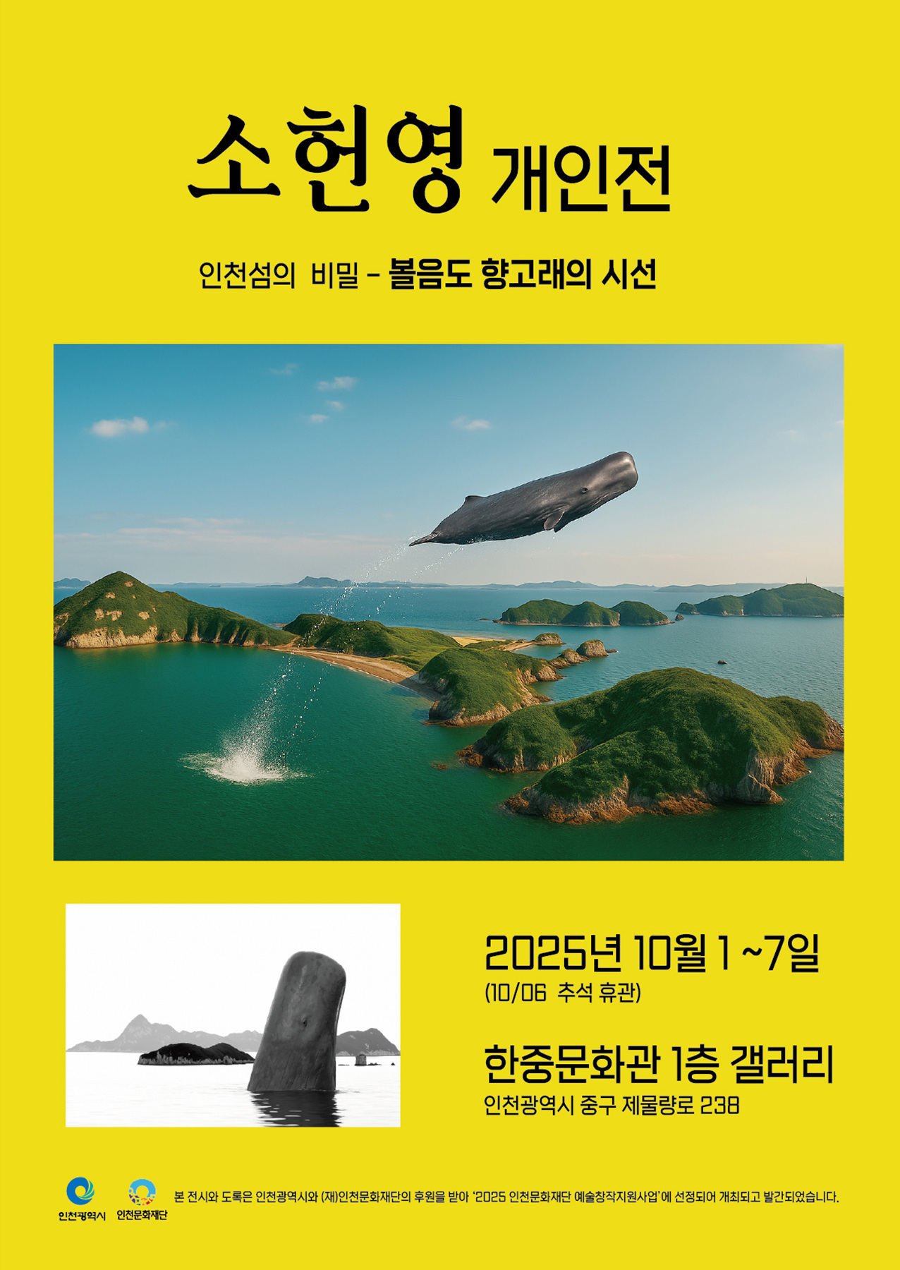 향유고래는 바다 위에서 서서 잠들며, 한쪽 눈과 반쪽 심장을 깬 채로 세상을 바라본다. 이번 전시는 그 깨어 있는 시선을 빌려, 인천 섬들의 풍경과 전설을 탐색하는 여정이다.